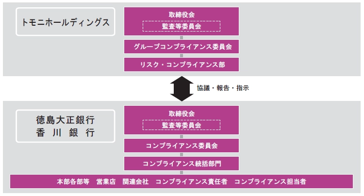 当社グループは、あらゆる法令やルールを厳格に遵守するとともに、法令等の整備の有無にかかわらず、社会的規範やお客さまの正当な利益に反することのないよう、公正かつ誠実な企業活動を通じて、地域金融グループに相応しい法令等遵守態勢を確立します。