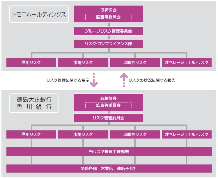 銀行子会社においても、「リスク管理委員会」及び「ALM委員会」を設置して各銀行のリスク状況の把握に努め、各種リスクを統括する部門を定めてリスク管理態勢の高度化を図っています。